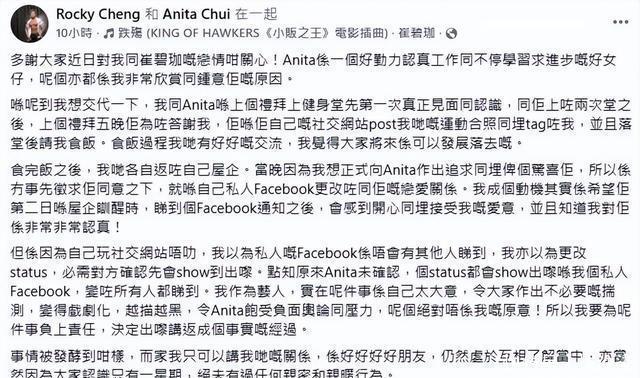 近日,58岁前TVB男星郑健乐突然高调单方面官宣,与�岁的女星崔碧珈拍拖,引起关注!但事后女方却回应否认恋情,澄清自己仍然是单身,并强调两人只是好朋友的关系,双方各执一词,令事件持续发酵,吸引不少网民热议:到底葫芦里卖的是什么药?       郑健乐�年《香港先生选举》“健力组”冠军,入行多年拍过不少剧,不过一直被批演技生硬,他主要收入是从事健身教练的工作,但疫情期间健身室被迫多次停业,一度零收入,2021年又与妻子离婚,他更要独力抚𲻐名患有自闭症的儿子,经济压力巨大。       而崔碧珈则出身富裕家庭,经常在社交平台大晒富贵生活,不但有豪车及保姆,更乘坐私人飞机代步,虽然不时炫富,但她一向低调处理感情事,而且她与郑健乐素无交集,年龄又相差一大截,因此郑健乐官宣恋情后,令网民大感震惊。       但随着崔碧珈否认恋情后,网民的态度却发生变化,不少人纷纷涌入她的社交平台狠批,怒斥她欺骗男方感情,不敢承认拍拖,而她亦不甘示弱霸气反击,声称自己才是受害者。事件持续发酵数日,始作俑者郑健乐终于现身回应,没想到令事情再度大反转!       郑健乐公开向崔碧珈道歉,声称自己其实只是想向她示爱,但没想到事情会发展成这样,更没想到网友会去攻击她。       原来,两人相识才一个星期,而且总共才见过一面,而郑健乐被她深深吸引,于是将社交账户与对方绑定为“恋爱中”关系,寓意向对方正式展开追求。       他表示,自己只是想给女方一个惊喜,以为第二天早上崔碧珈起床看到后,会接受他的表白。但未料因为自己不熟悉平台的规则,误以为此操作是私密形式只有双方才能见,结果却是公开全网可见,第二天直接登上娱乐头条,并引发轩然大波,令女方遭受攻击。       郑健乐又称,认同崔碧珈所指双方“只是好朋友关系”,澄清二人只是相识一个星期,从来没有任何亲密行为,不希望外界对误会而对女方声誉造成影响。不过,最后他坚持认为,双方仍然可以继续发展下去,并希望广大网友给予空间,保护爱苗。       对于郑健乐的这则道歉解释,网民反应两极化,有人赞他老实,起码有勇气出来承认错误;不过亦有人炮轰他越描越黑,怒斥他幼稚、将�岁处事却如此儿戏,还连累女方无辜受牵连,认为他只是一厢情愿。至此,整件事终于水落石出了。       责编:曾泽熙       转载须注明;严厉打击抄袭,侵权必究